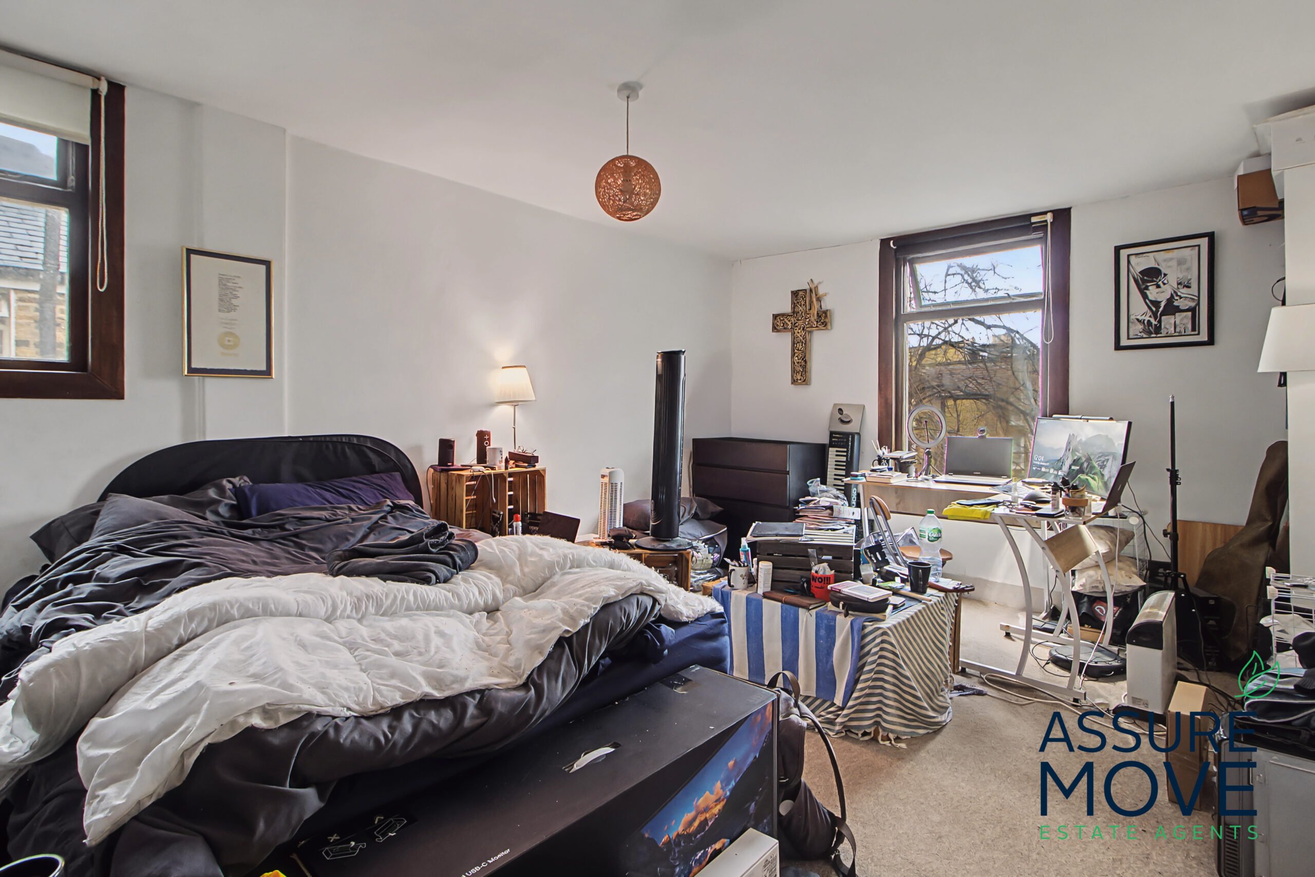 The property benefits from a bright and spacious reception-style bedroom with large windows allowing plenty of natural light, alongside two further bedrooms which can be used flexibly as sleeping accommodation, guest space, or home working areas. The separate kitchen provides ample storage and worktop space, with room for dining and direct access to a bay window seating area, creating a bright and usable everyday living space.