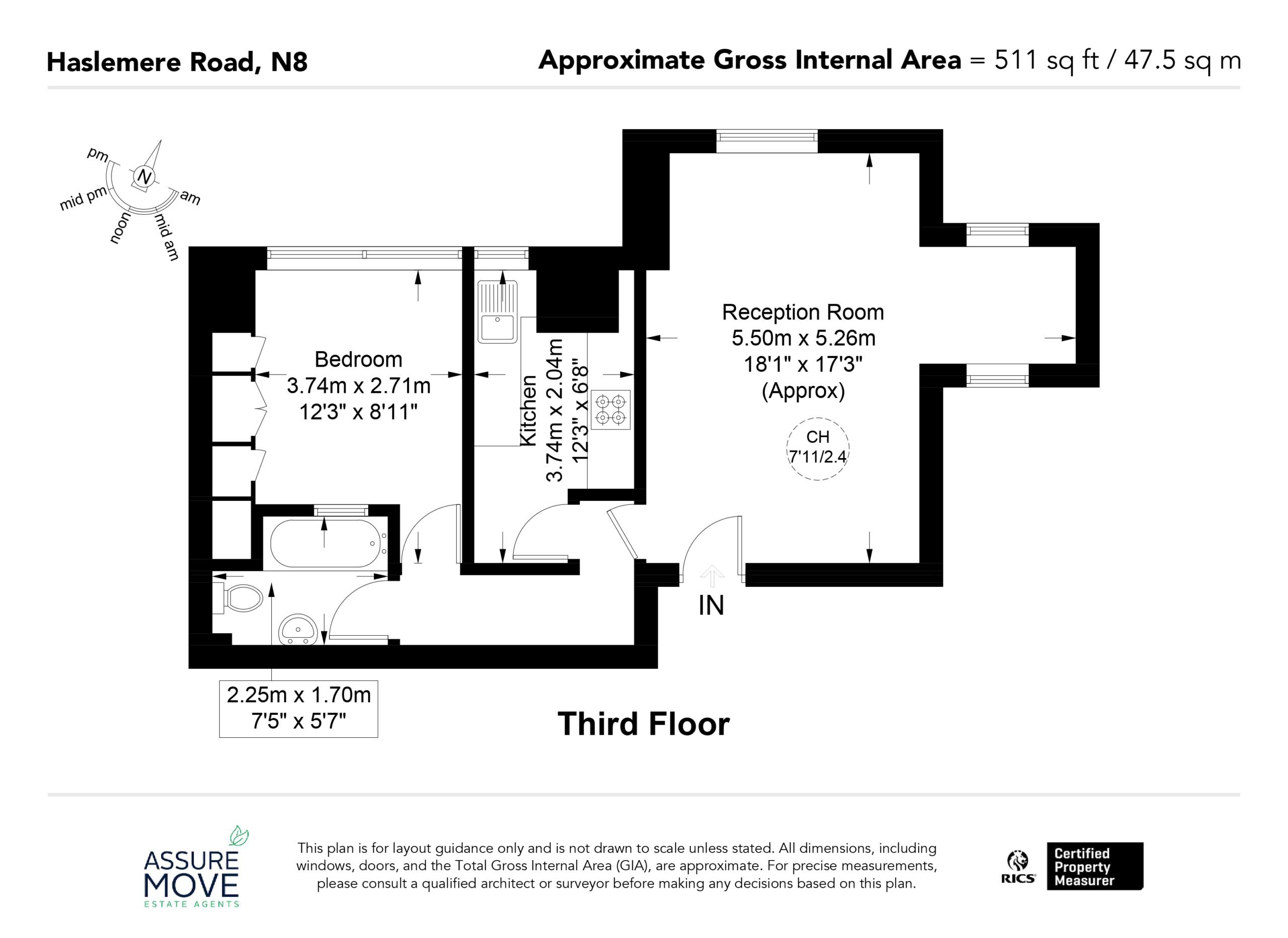 With 511 sq ft / 47.5 sq m of internal space, the flat provides a comfortable layout including a bright and spacious 18ft reception room with distinctive angled ceilings, a separate fitted kitchen, and a quiet double bedroom positioned away from the main living area.