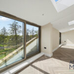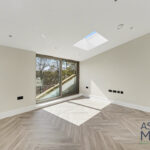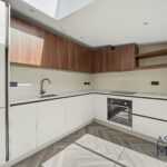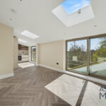 The property boasts a spacious open-plan reception and kitchen area, flooded with light from large windows and skylights. The sleek, fully fitted kitchen features high-quality integrated appliances, a generous island unit, and modern cabinetry – perfect for both everyday living and entertaining.
