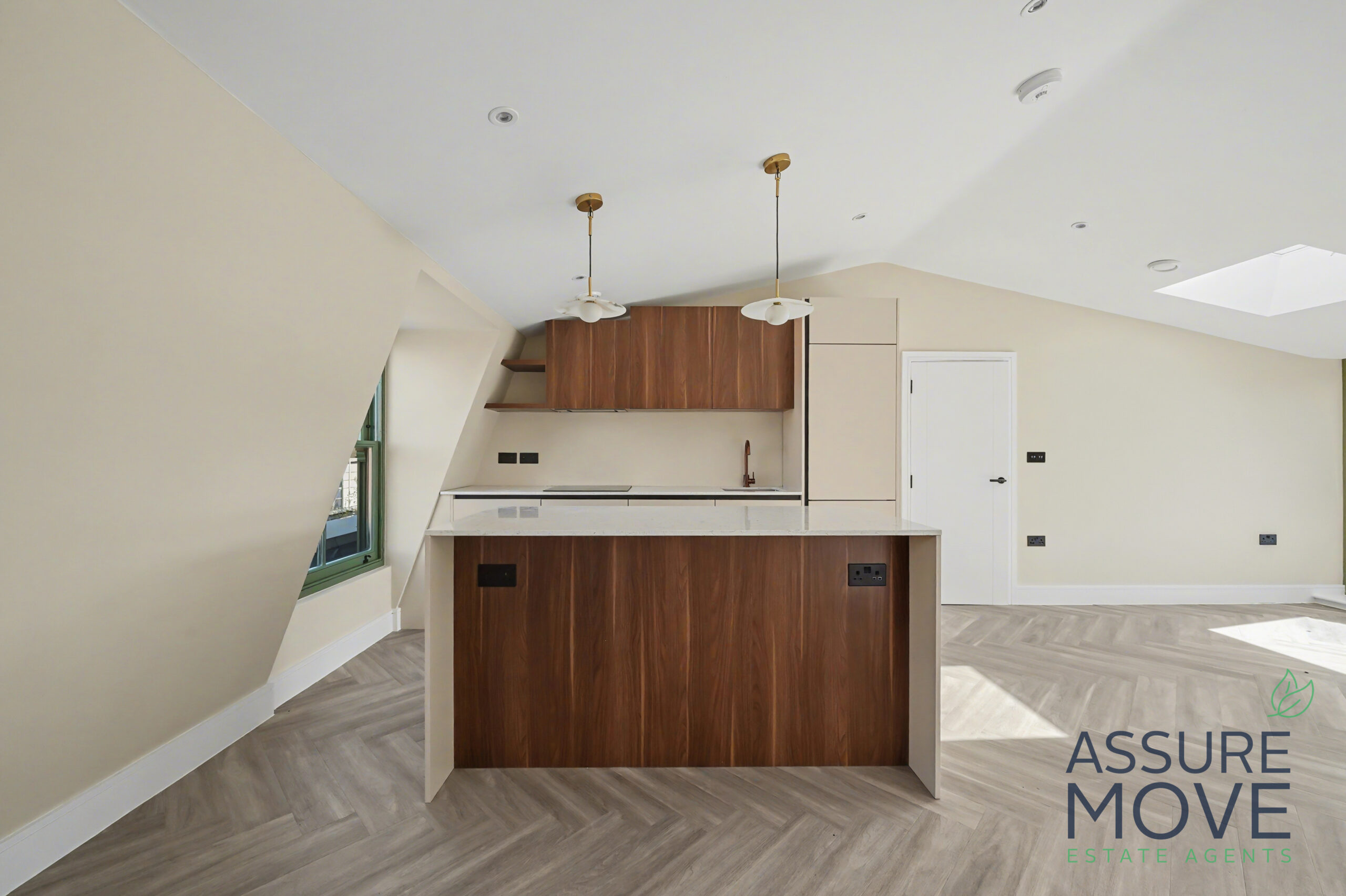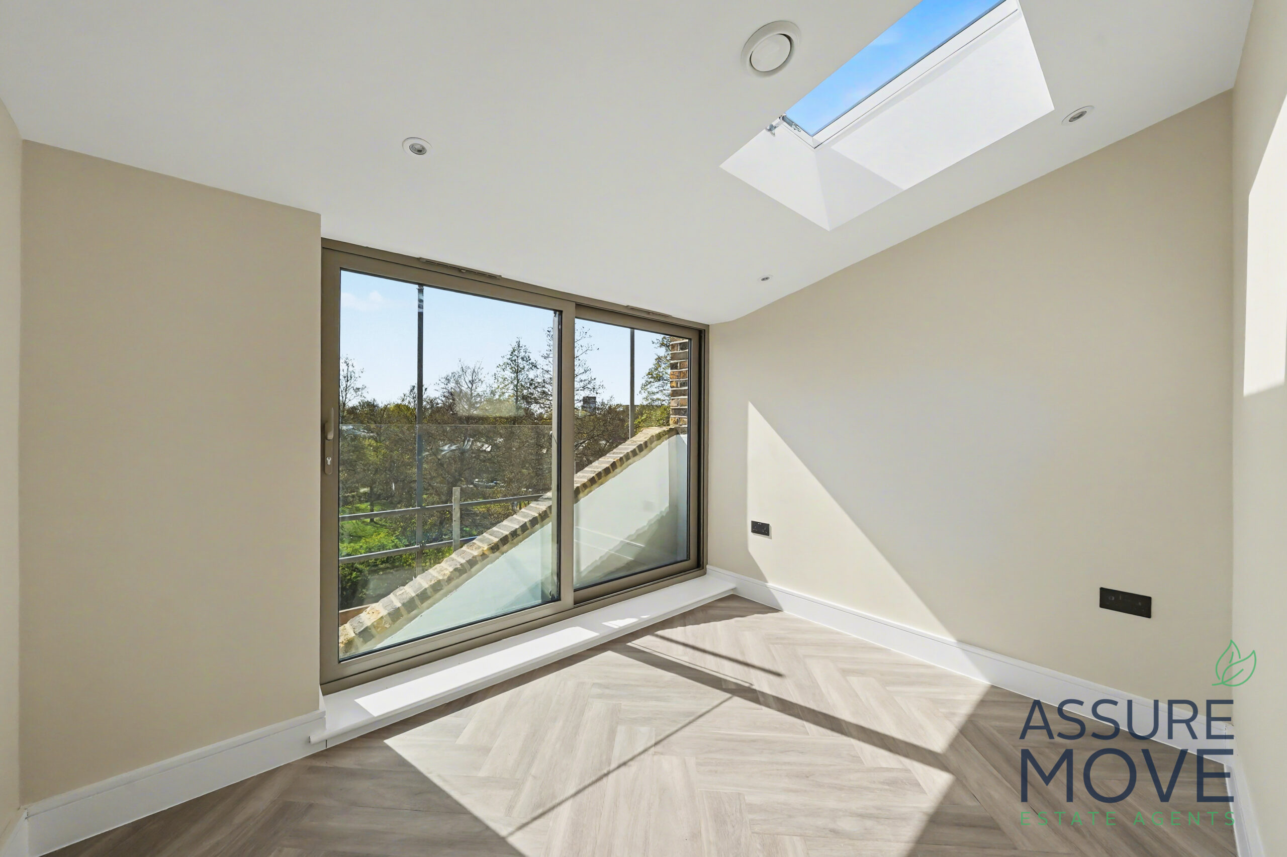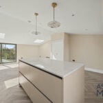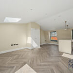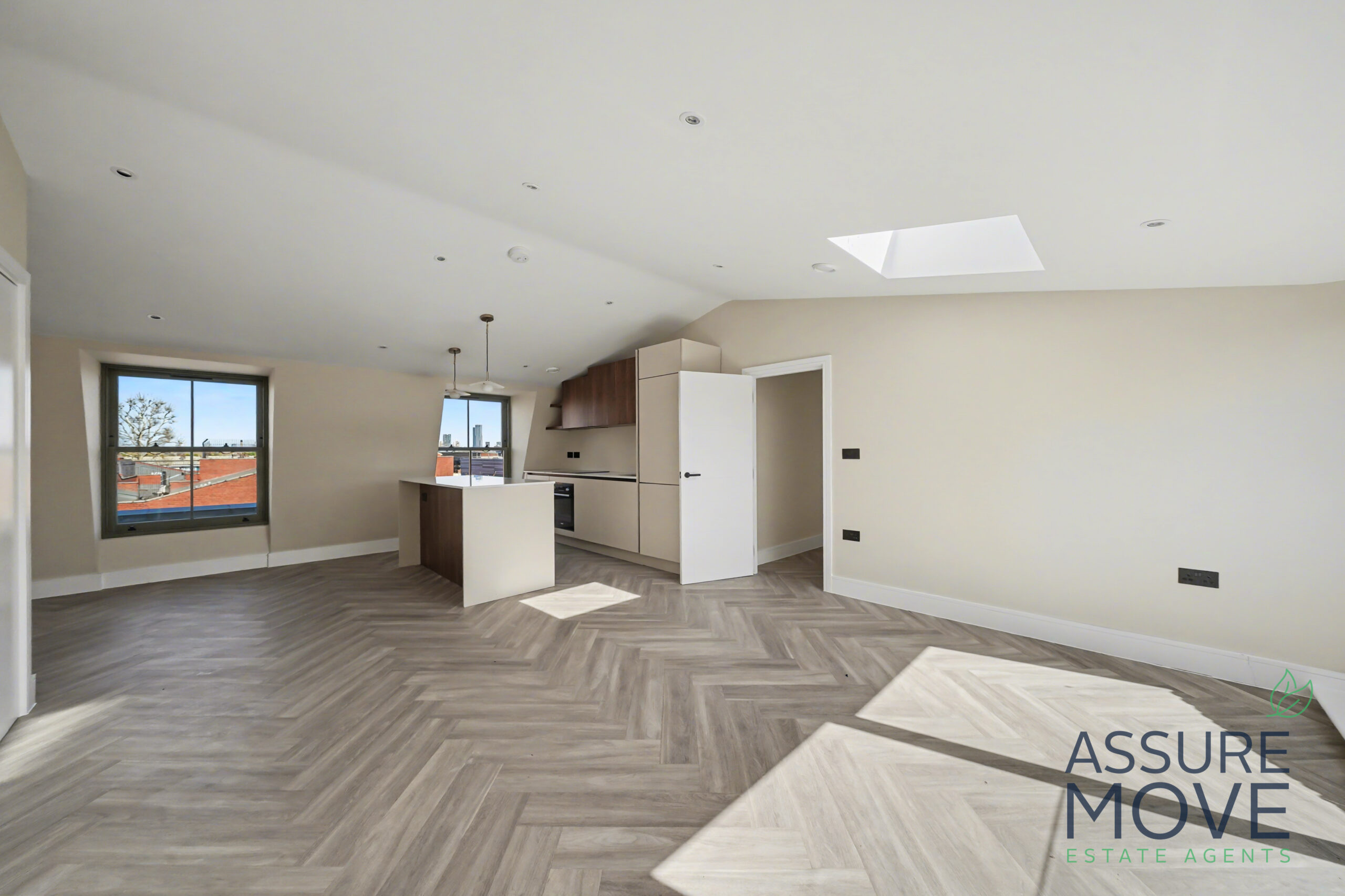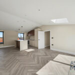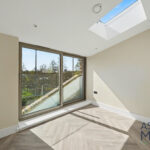 The property boasts a spacious open-plan reception and kitchen area, flooded with light from large windows and skylights. The sleek, fully fitted kitchen features high-quality integrated appliances, a generous island unit, and modern cabinetry – perfect for both everyday living and entertaining.